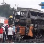 शनिवारी पहाटे ४-५ च्या सुमारास हा अपघात झाला आहे. ही बस दुसऱ्या वाहनाला धडकल्याने बसमध्ये अचानक आग लागली. या अपघातावेळी बसमध्ये प्रवासी साखरझोपेत होते. त्याचदरम्यान अचानक बस आणि एका डंपरची समोरासमोर धडक बसली. यानंतर बसने अचानक पेट घेतला. बसनं पेट घेतल्यानंतर काहींनी खिडक्यांमधून खाली उडी घेत जीव वाचवला. पण काही प्रवाशांना अचानक घडलेल्या घटनेमुळं बसमधून बाहरे पडता आलं नाही. त्यातच त्यांचा दुर्देवी मृत्यू झाला. आत्तापर्यंत या भीषण अपघातात ११ जणांचा मृत्यू झाला आहे. काही प्रवासी जखमी आहेत. त्यांना जवळच्या रुग्णालयात दाखल करण्यात आले आहे.